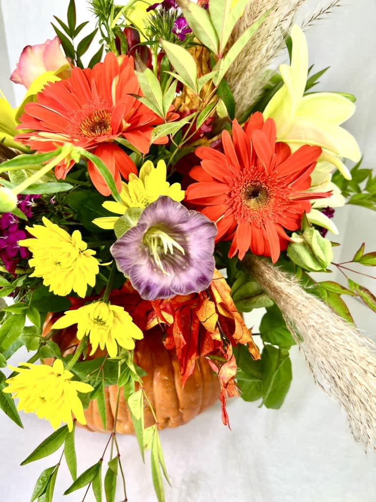 Fresh Flower Pumpkin Arrangements are a really fun part of fall floral design. This whole pumpkin has a tray that holds water and flowers up on top to create a unique fall flower display. In Alaska, I recommend removing the tray and spent flowers and putting it outside on your porch for the moose to munch!